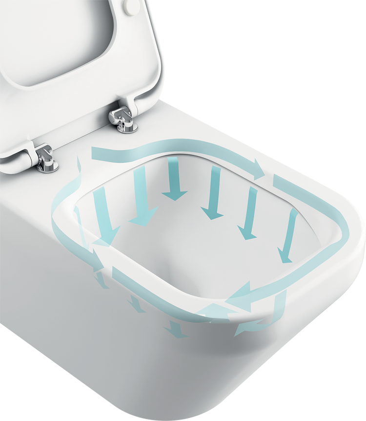 Mientras que los inodoros tradicionales no limpian el 100% del wc este sistema te asegura una limpieza 100% por debajo del canal de agua. Situada la salida de agua en la parte posterior de la taza hace que el agua recorra toda la superficie sin dejar un solo hueco sin limpiar, gracias también ha que estos inodoros no tienen brida lo que hace que el flujo de agua llegue a todos los rincones.